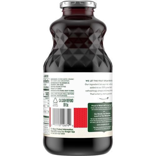 Simple Truth Organic No Sugar Addedˆ Tart Cherry 100% Juice is delicious in every sip. With the sweetness of organic tart cherry juice concentrate, there is no sugar addedˆ to this alluring blend. This USDA organic, non-GMO beverage is a testament to 100% juice.